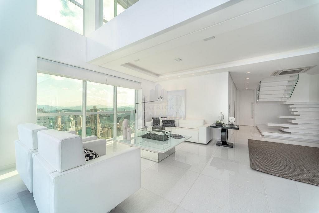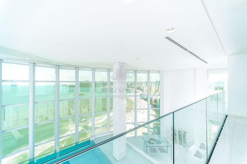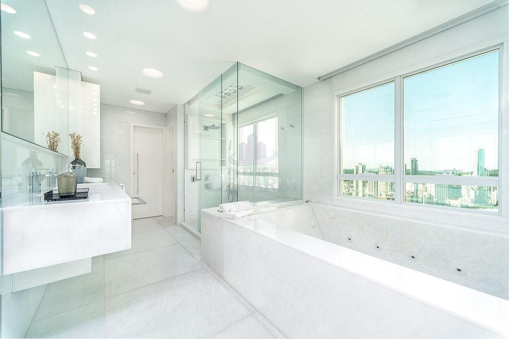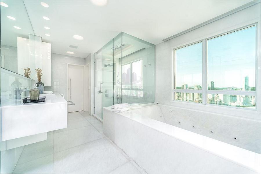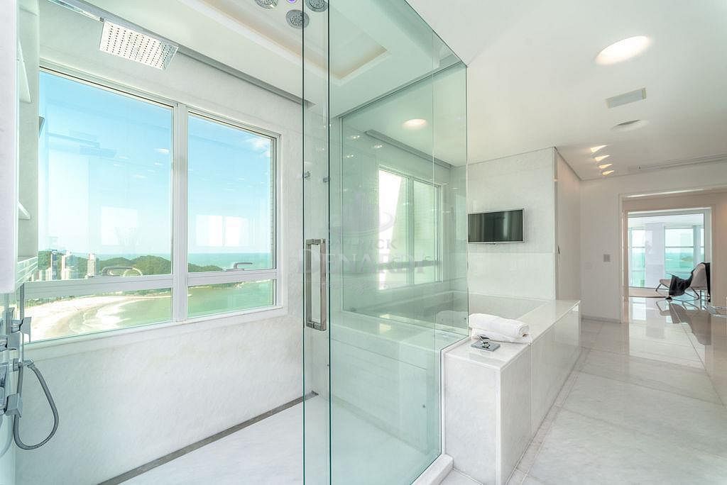 • A cobertura ainda possui persianas automatizadas, acesso do elevador social aos 2 pavimentos e portas de acesso blindadas, além de piso em mármore Thassos - um mármore branco puro extraído da Grécia, sendo o material de tonalidade branca mais claro que a Natureza oferece. Andar alto, 40º pavimento, fino acabamento e área de lazer completa, em plena Avenida Atlântica, na Praia Central de Balneário Camboriú.